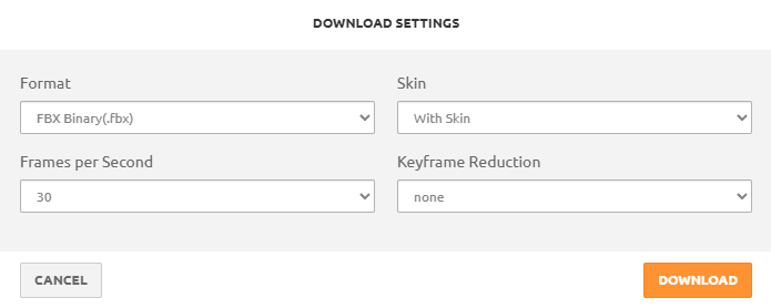 Allí podemos seleccionar con o sin skin, si seleccionamos sin skin, se descarga solo el armature o esqueleto. A continuación se verán el resultado final y una breve explicación.