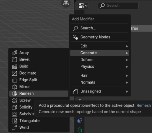 Ahora vamos a los modificadores para cambiar la malla y vamos a buscar la opción remesh