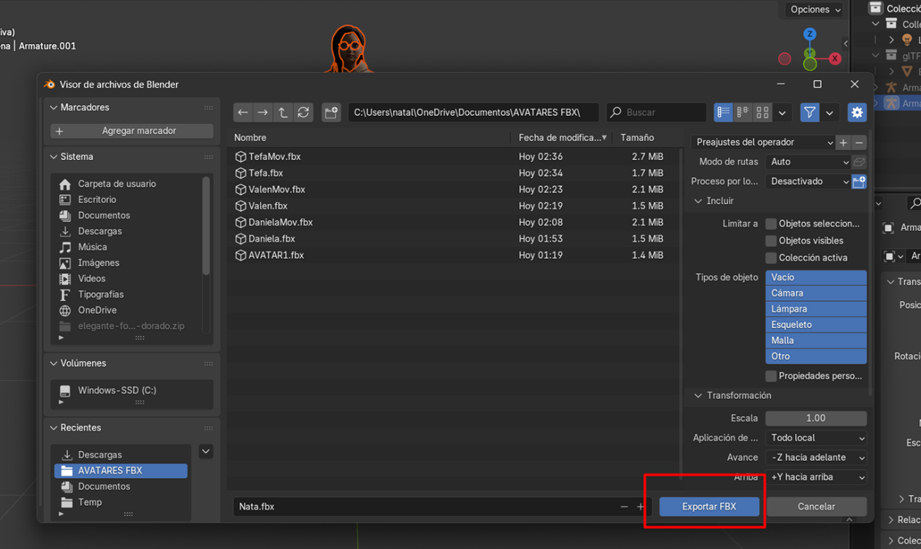 Lo exportamos y le damos en la opción de guardarlo en .fbx