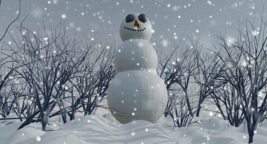 La animación inicia con un ambiente frío y silencioso en el exterior, donde un muñeco de nieve aparece en calma. Esta escena funciona como introducción atmosférica, anticipando que algo inusual está a punto de suceder.