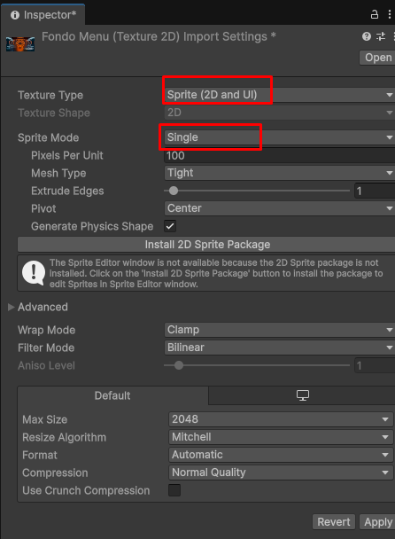 Esto permite que Unity reconozca la imagen como un sprite adecuado para interfaces y pueda utilizarse correctamente dentro del Canvas.