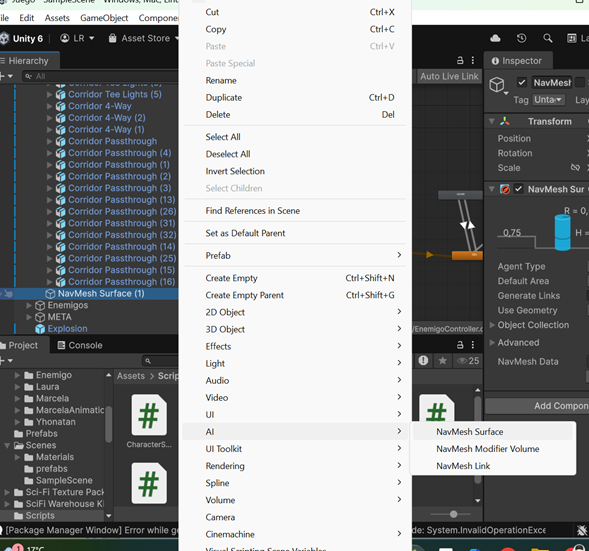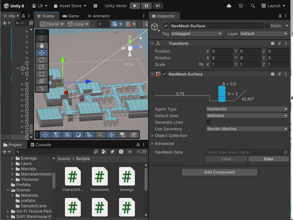 Lo más importante para que el enemigo pueda funcionar correctamente y desplazarse por el mapa es crear un NavMesh Surface.