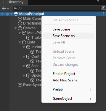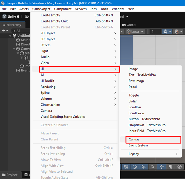 Esto crea automáticamente un Canvas en la escena, junto con un EventSystem necesario para manejar interacciones en la interfaz.