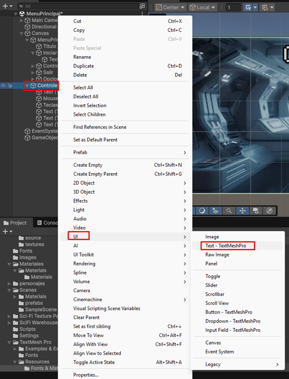 Para agregar los botones, seleccionamos el panel que creamos y, sobre él, hacemos clic derecho → UI → Button (TextMeshPro).