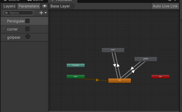 Construimos los bucles de transición entre animaciones dentro del Animator Controller, definiendo cuándo y cómo cambia cada animación según el comportamiento del personaje.