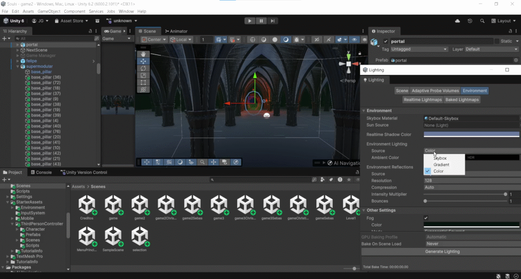 Ajustó posiciones, colliders, iluminación base y distribución general de los elementos.