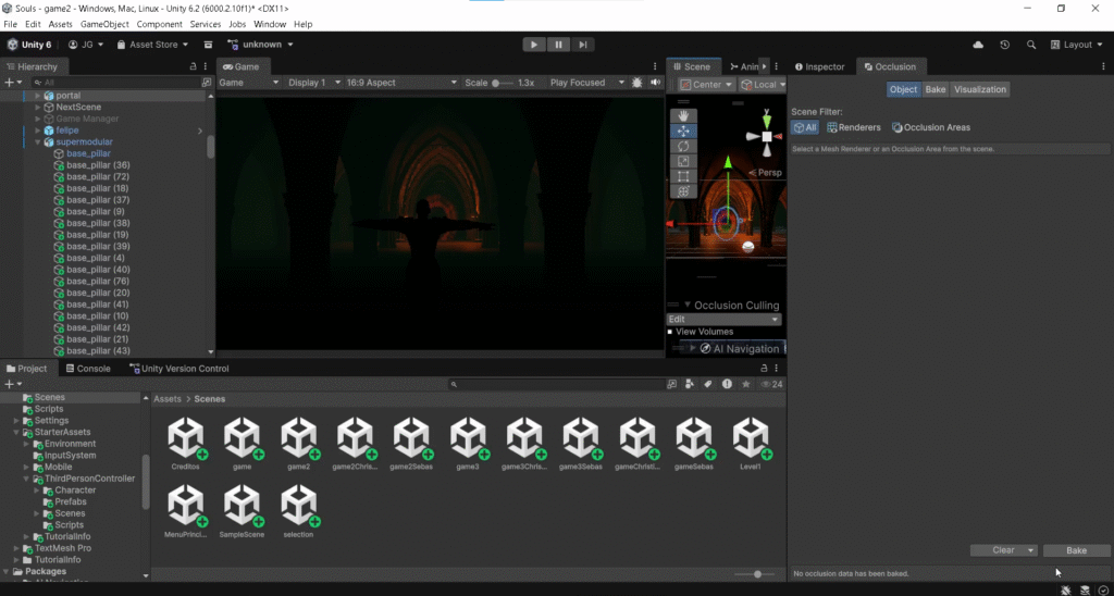 El proceso de optimización final consistió en aplicar o eliminar por completo los modificadores, simplificar la topología de los modelos y remover vértices, segmentos y uniones que no aportaban nada estructural al diseño. Cada módulo fue revisado uno a uno hasta dejar únicamente la geometría indispensable para mantener la forma visual. Al reimportar todos los modelos en Unity, el resultado fue inmediato: la tasa de fotogramas aumentó de forma notable, la escena se volvió mucho más ligera y finalmente pudimos aplicar técnicas de optimización como el occlusion culling con total eficacia.