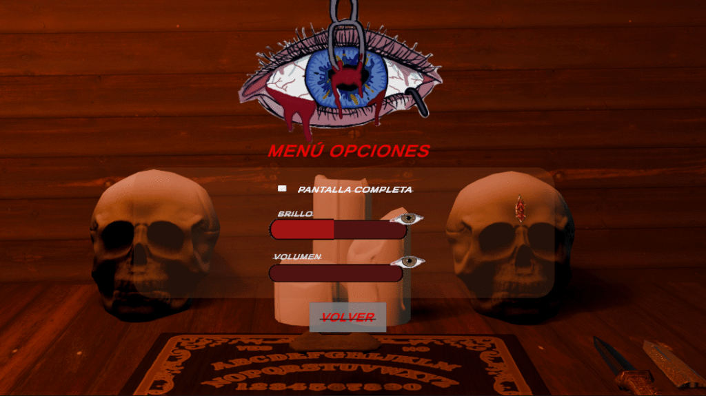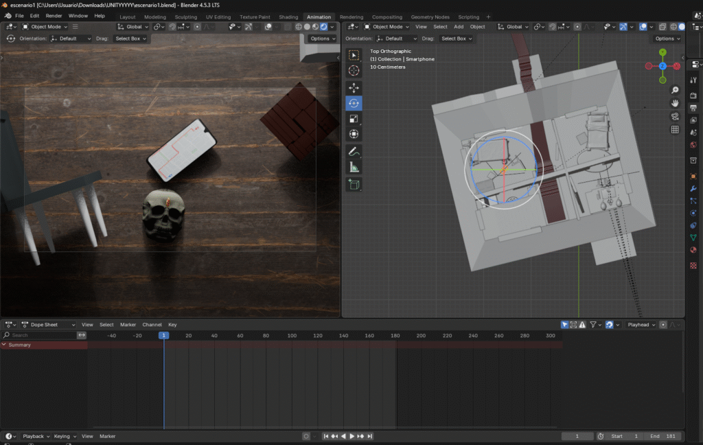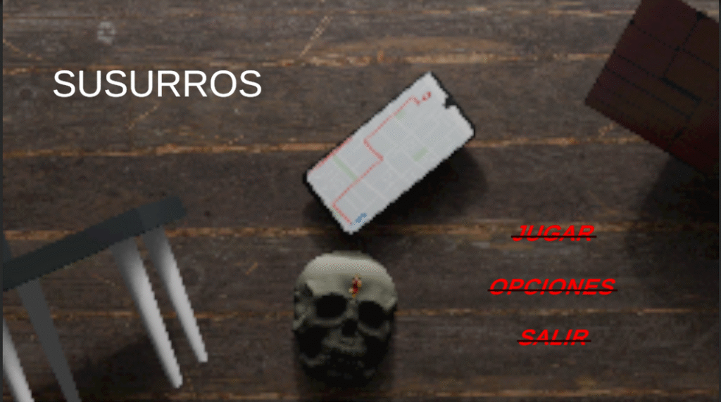 Para el fondo del menú principal, se creó una animación en Blender utilizando un escenario previamente desarrollado: una casa inspirada en la película Monster House y en referencias tomadas de la aplicación Randomnáutica. La animación se realizó utilizando el Timeline de Blender, donde, a través de keyframes, se generó una secuencia de movimientos que aportan dinamismo y ambientación a la escena.
