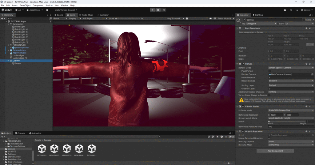 Luego, para integrar el video en Unity, se importó el archivo a una carpeta del proyecto con el fin de mantener una organización adecuada. Para utilizarlo como fondo dentro del Canvas y asegurar su reproducción al iniciar la escena, se añadió un componente “Raw Image” en la jerarquía. Posteriormente, en la carpeta donde se encontraba el video, se creó un Render Texture, el cual permite proyectar la animación dentro del elemento de interfaz y visualizarla correctamente en el menú principal.