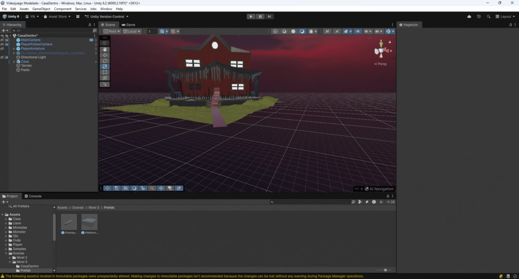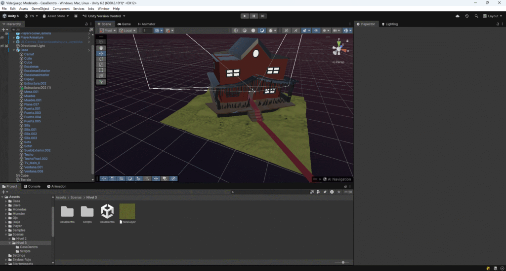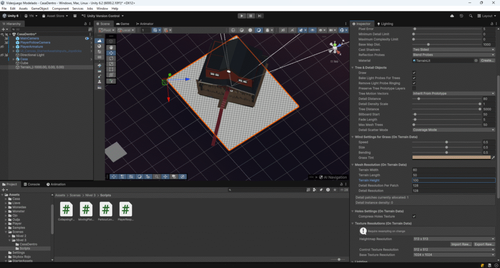 Después de añadir el terreno, se ajustó su posición para alinearlo correctamente con la casa. Luego, desde el Inspector, en la ruta Terrain > Terrain Settings > Mesh Resolution (en Terrain Data), se modificó el tamaño del terreno para adaptarlo a las dimensiones necesarias del escenario. Con estos cambios, el terreno quedó acomodado y acorde a la ubicación y escala de la casa dentro de la escena.