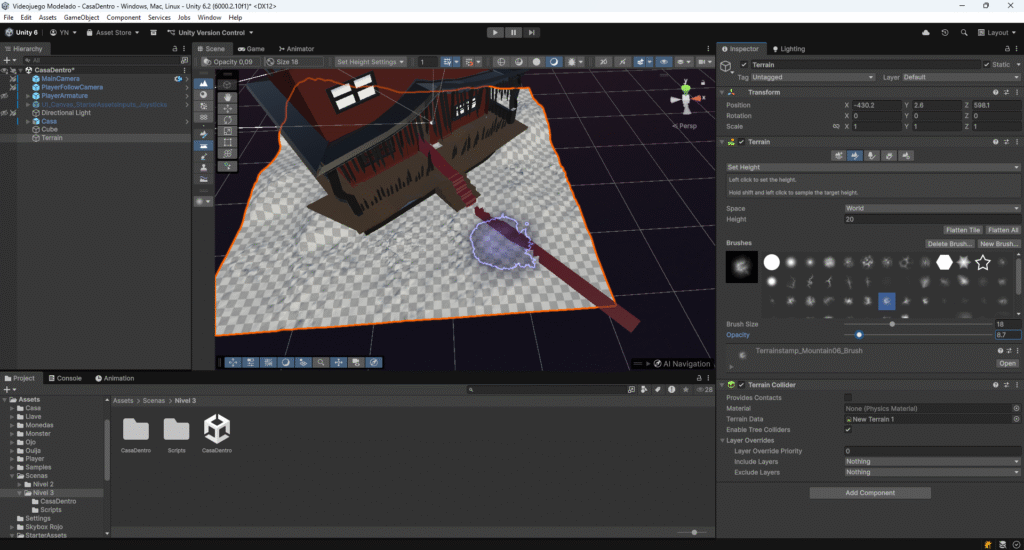 Para modificar la estructura del terreno, desde el Inspector, dentro de la sección Terrain, se ingresó a la opción Paint Terrain y se configuraron las propiedades necesarias. Luego se seleccionó el pincel correspondiente y se procedió a moldear el terreno según las preferencias del escenario, ajustando alturas y formas conforme a lo requerido.