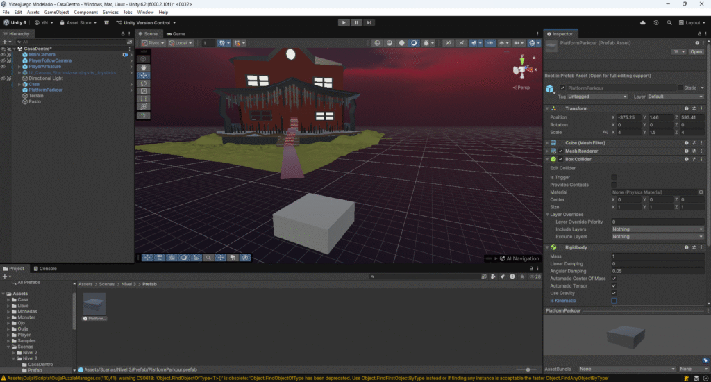 Ahora, para hacer las plataformas donde el jugador va a saltar, desde la Hierarchy se agrega un objeto 3D de tipo Cubo. A este se le modificaron las dimensiones necesarias y se ubicó justo donde finaliza el terreno. Luego, desde el Inspector, se añadió el componente Rigidbody, configurándolo con Is Kinematic activado y Use Gravity desactivado. Después de esto, el cubo se arrastró hacia la ventana Project para convertirlo en un Prefab, y finalmente se eliminó de la escena para utilizar únicamente su versión prefab al momento de colocar las plataformas.