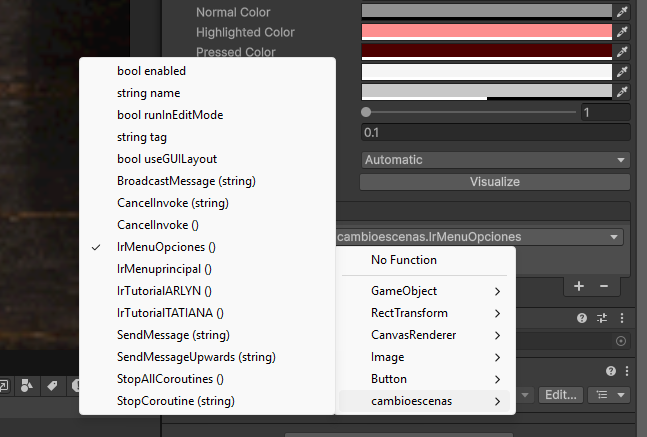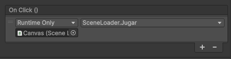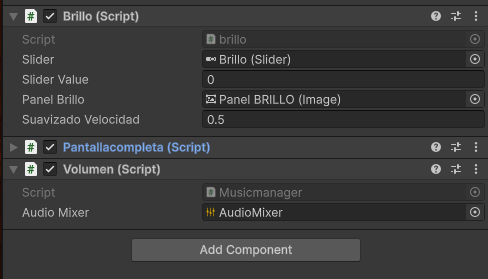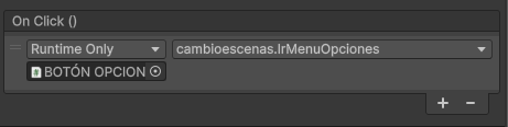 Se implementa el script en un GameObject vacío que creamos para que tenga un control de los eventos que definamos através de los scripts, como lo son el brillo, la pantalla completa, el volumen y en este caso el evento de escenas. Cuando se da click al botón se vincula el canvas y en la parte derecha llamamos a la función del script