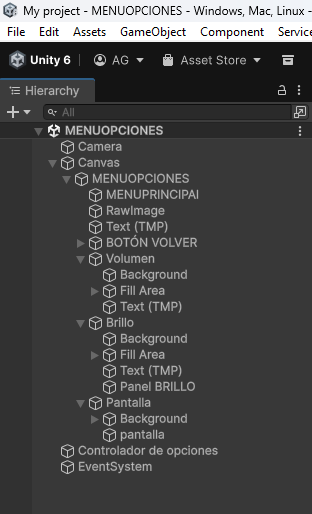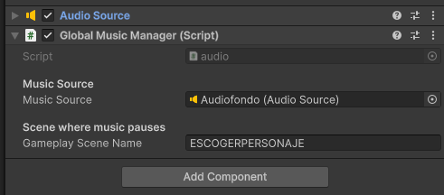 En esta escena, también se agrego un audio que actúa de forma global con el fin de poder escucharlo en otras escenas y poder alterarlo en la escena de Menú opciones.