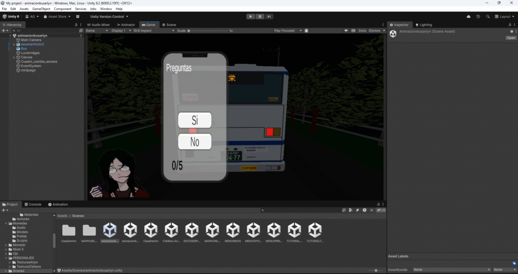 Para la escena de créditos se utilizo la escena de la animación de bus que utilizamos en el videojuego, está escena aparecerá cuando el jugador supere el nivel de parkour e interactue con el bus. Aquí solo dejamos un texto estático pero la animación se muestra de forma exitosa de fondo. El bus al llegar a un box collider que predefinimos en el mapa, dirige al jugador al menú de inicio.