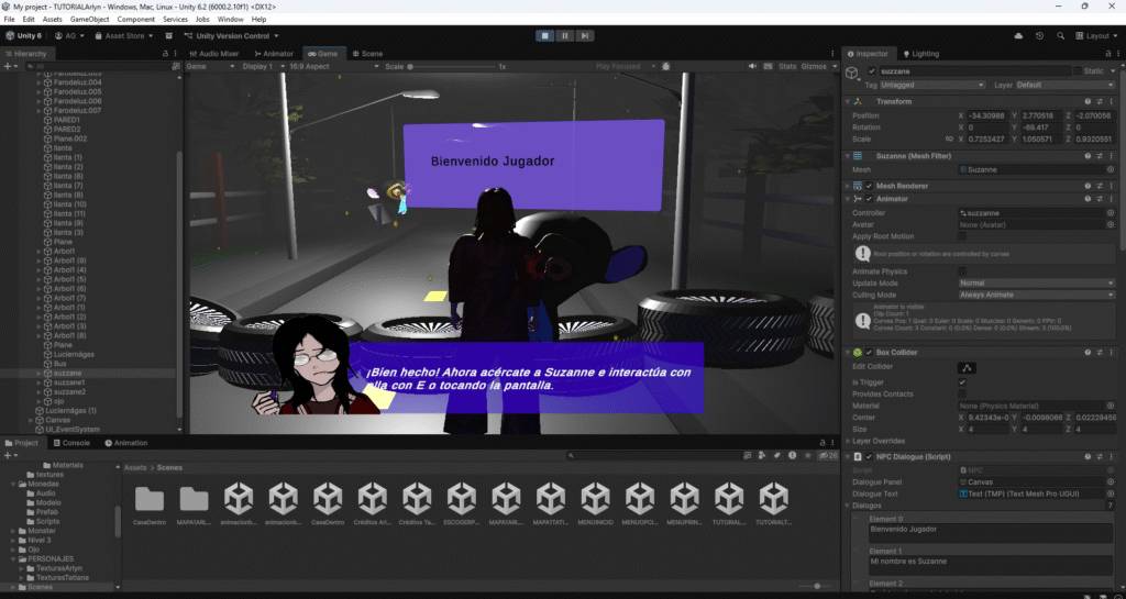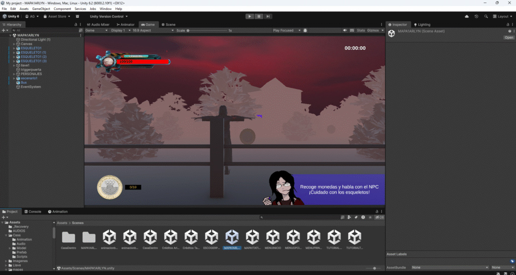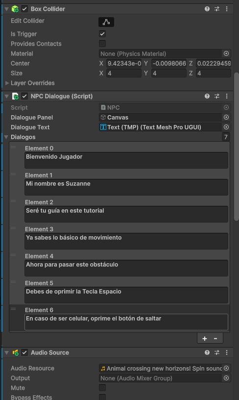 • La interacción con el NPC nos ayudó a fortalecer la dimensión narrativa del juego al permitir diálogos, entrega de objetos y activación de eventos. Este sistema mostró cómo la comunicación entre jugador y personajes no jugables puede enriquecer la experiencia y guiar el progreso dentro del mundo del juego.