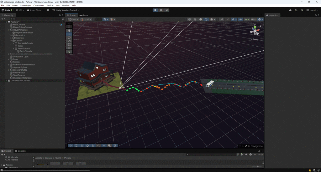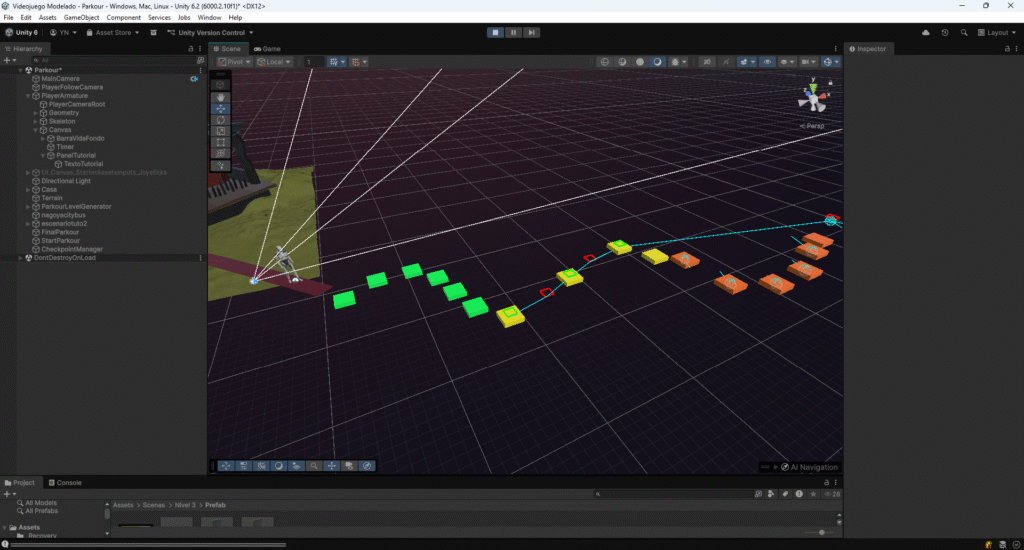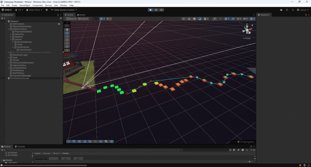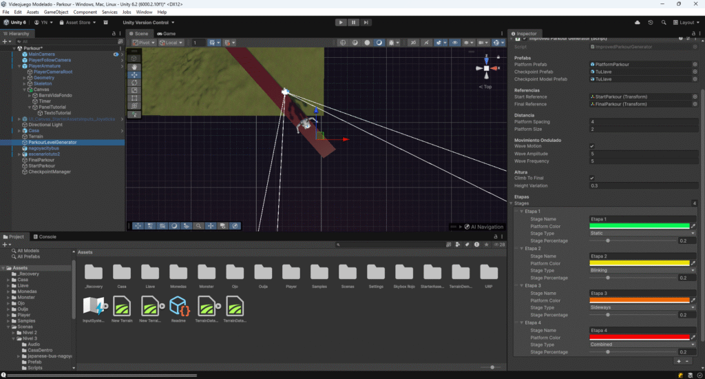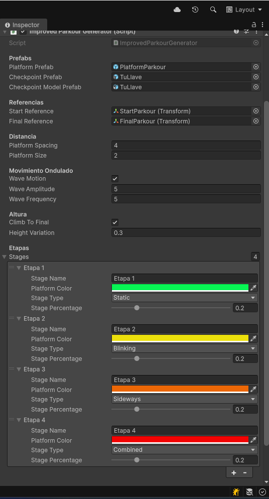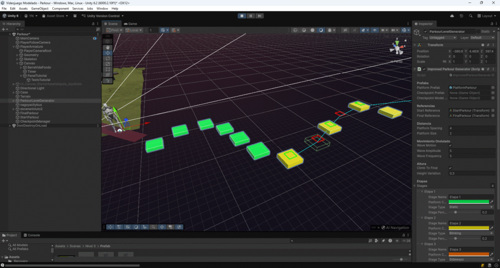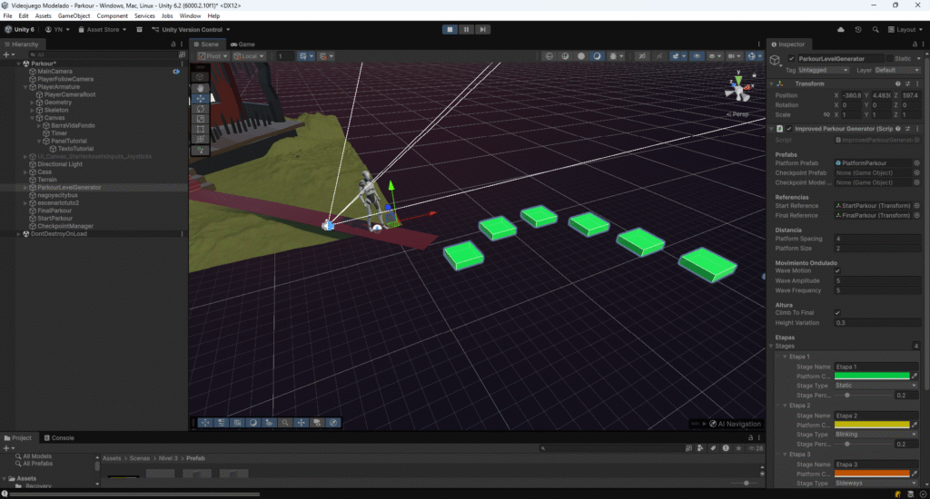 De esta manera, el ParkourLevelGenerator se convierte en la herramienta principal para estructurar y automatizar todo el recorrido del nivel. Su correcta configuración garantiza coherencia visual, mecánica y de dificultad en cada etapa del parkour, permitiendo que la escena se genere de manera automática y sin necesidad de colocar cada plataforma manualmente. Además, facilita realizar ajustes rápidos en la disposición, colores o comportamiento de las plataformas para probar distintas variantes del nivel.