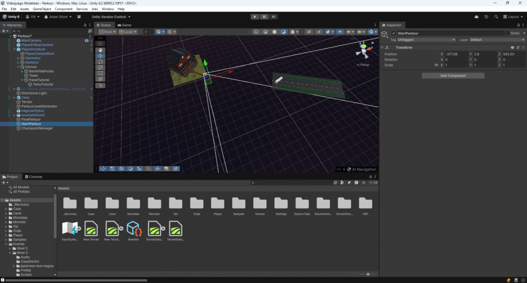 Adicionalmente, se añadieron dos objetos vacíos denominados StartParkour y FinalParkour, que sirven para definir con precisión el inicio y el final del camino del parkour. Estos objetos también se vincularon al script para que el generador pudiera calcular correctamente la posición y orientación de todas las plataformas intermedias. Gracias a esto, el recorrido tiene un punto de inicio y un punto final claros, garantizando que el jugador pueda avanzar de manera lineal y fluida a lo largo del nivel.