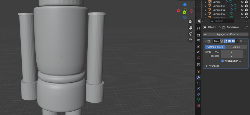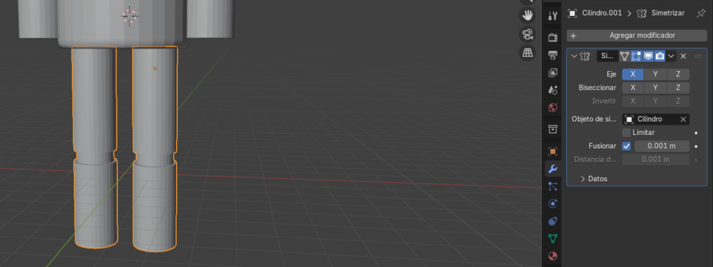 Creamos otro cilindro y lo ajustamos donde queramos colocarlo para hacer las piernas y lo duplicamos con Control + D y se coloca como el brazo