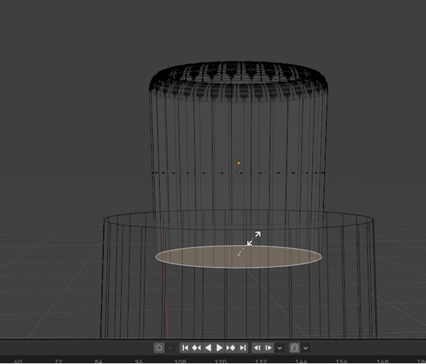 Después de confirmar la posición del corte, se seleccionó la sección inferior (en modo de selección de caras o vértices) y se aplicó la herramienta de escalado (S) para reducir ligeramente su tamaño. Este ajuste permitió que la parte superior quedara más ajustada mientras que la parte inferior conservara mayor volumen o generara un efecto de separación visual.