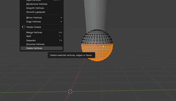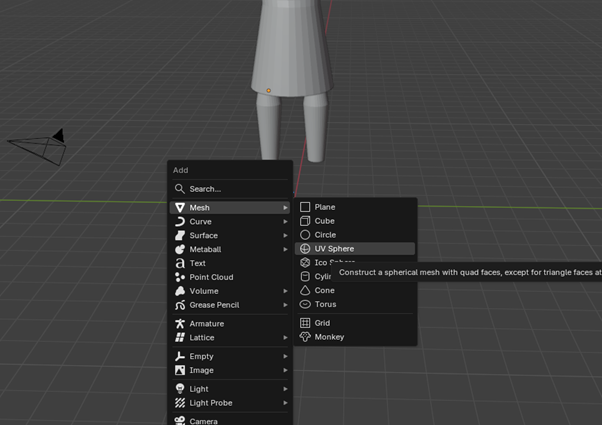 Para ello, se añadió una esfera mediante Add (Shift + A) → Mesh → UV Sphere. Esta figura se insertó en la escena y posteriormente se ajustó su escala con la tecla S para adaptarla al tamaño proporcional de las piernas.