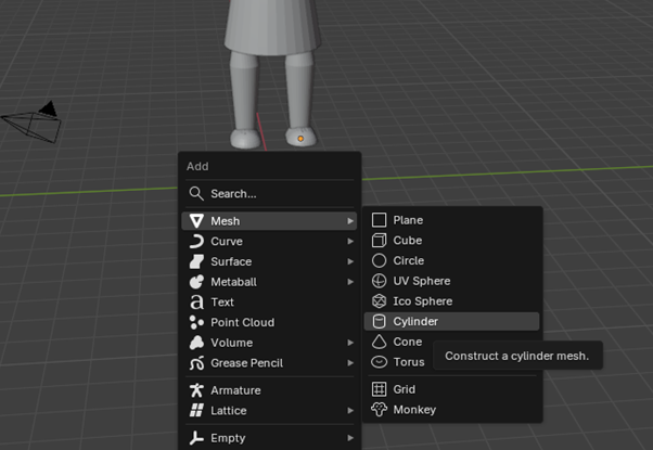 Para ello, se añadió una figura primitiva pequeña, generalmente una esfera (Shift + A → Mesh → UV Sphere) o un cilindro de poca altura, dependiendo del acabado deseado. Luego, se ajustó su escala con la tecla S para darle el tamaño adecuado en proporción al torso.