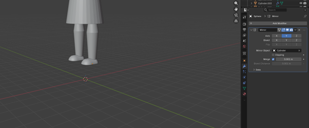 Posteriormente, se configuró el eje de simetría, en este caso el eje Y, para que la réplica se generara en el lado opuesto del cuerpo. Para asegurar que el espejo se realizara correctamente tomando como referencia el centro del personaje, se seleccionó el objeto del cuerpo como Mirror Object, garantizando que la duplicación respetara la alineación central del modelo.