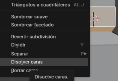 Luego seleccionamos con Shift las dos caras y clic derecho y seleccionamos disolver caras