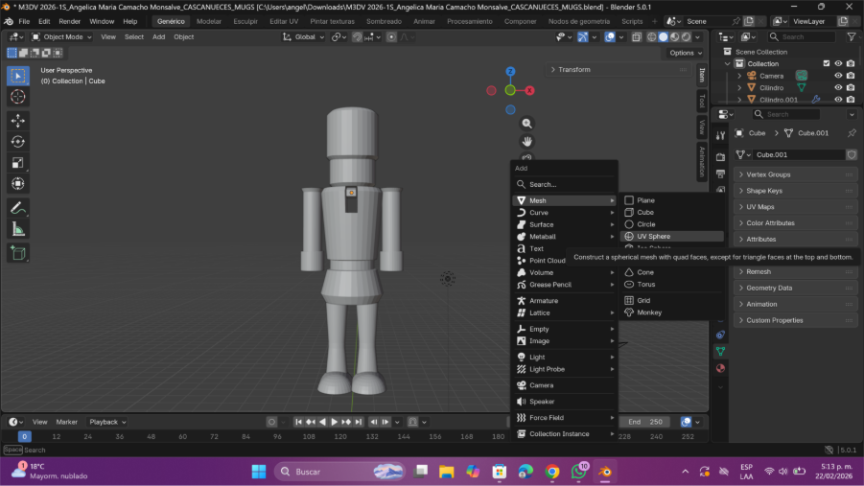 3. Agregar un cilindro: Usa Shift + A, selecciona Malla y luego Cilindro. Este será el cuerpo principal del cascanueces y servirá como base del resto del modelo.