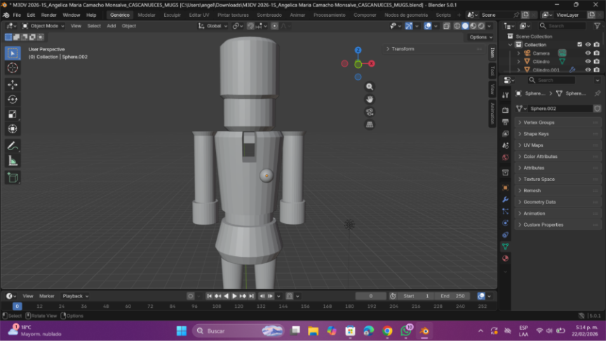 8. Crear la cabeza: Duplica el cilindro del cuerpo, muévelo hacia arriba y escálalo para darle forma. En modo edición redondea la parte superior usando Ctrl + B para suavizar los bordes.