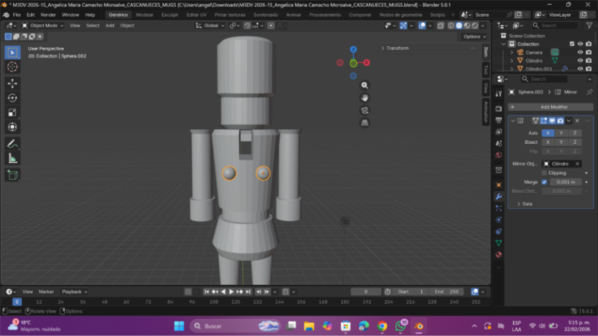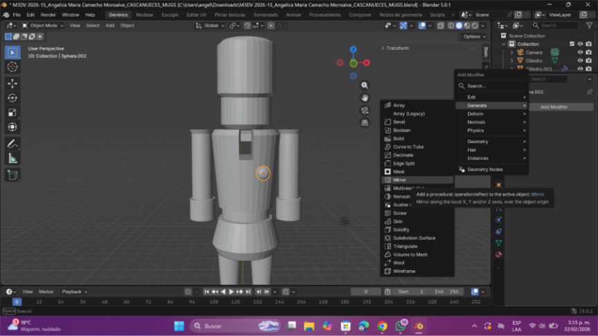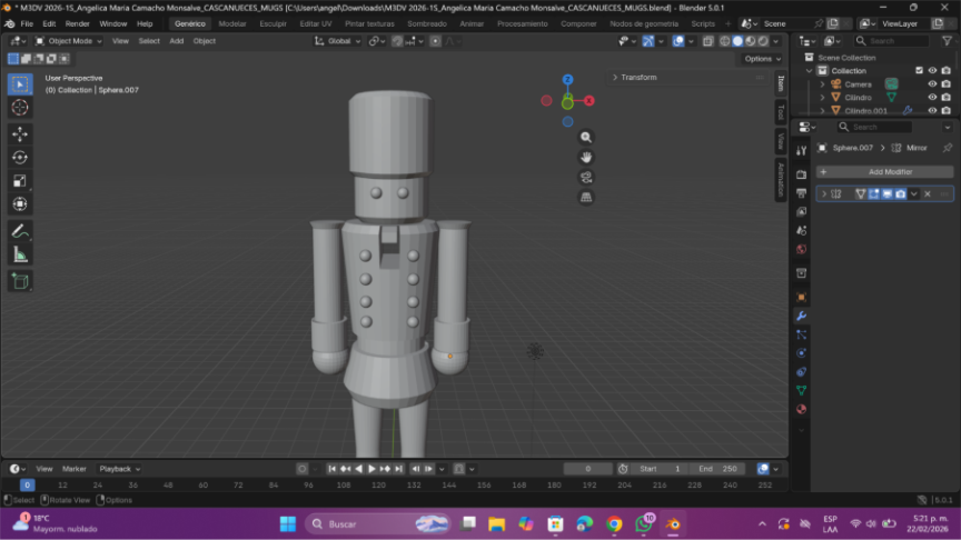 En esta guía se abordará paso a paso la creación de un cascanueces en Blender, empleando las herramientas esenciales del modelado tridimensional. El proceso iniciará con el uso de figuras geométricas simples como cubos, cilindros y esferas, que posteriormente serán modificadas mediante operaciones como extrusión, escalado, cortes de bucle (loop cuts) y biselado (bevel), permitiendo dar forma progresivamente a cada componente del personaje. Además, se incorporará el uso de modificadores, especialmente el de simetría, para facilitar la construcción equilibrada y precisa del modelo.