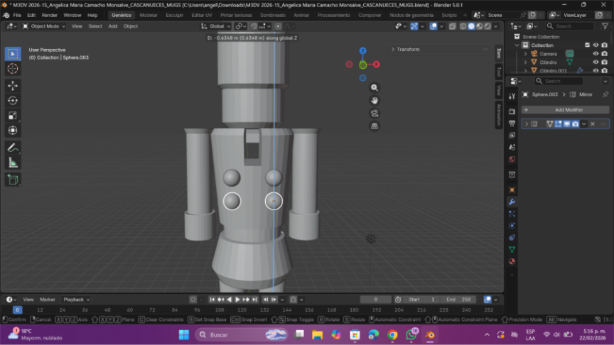 4. Mover el cilindro: Presiona G + Z para desplazar el cilindro verticalmente. Esto ayuda a posicionar correctamente el cuerpo sobre el plano.
