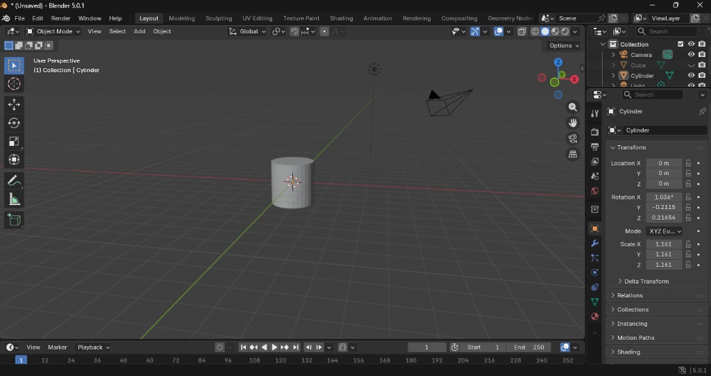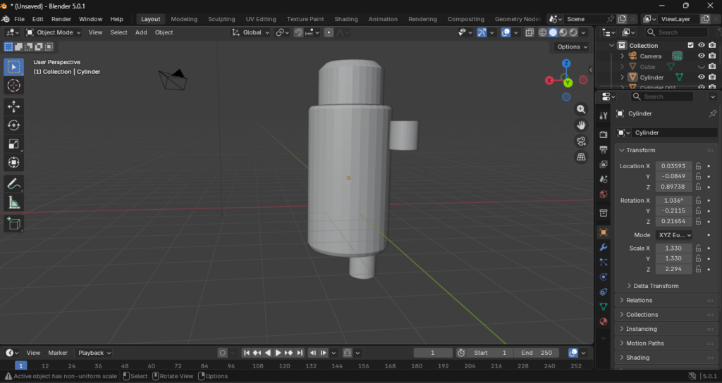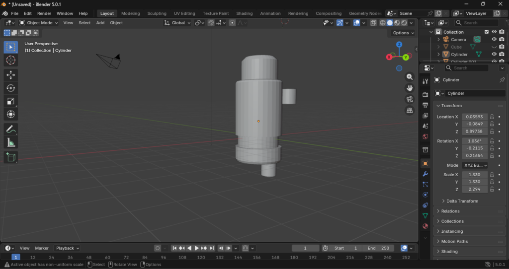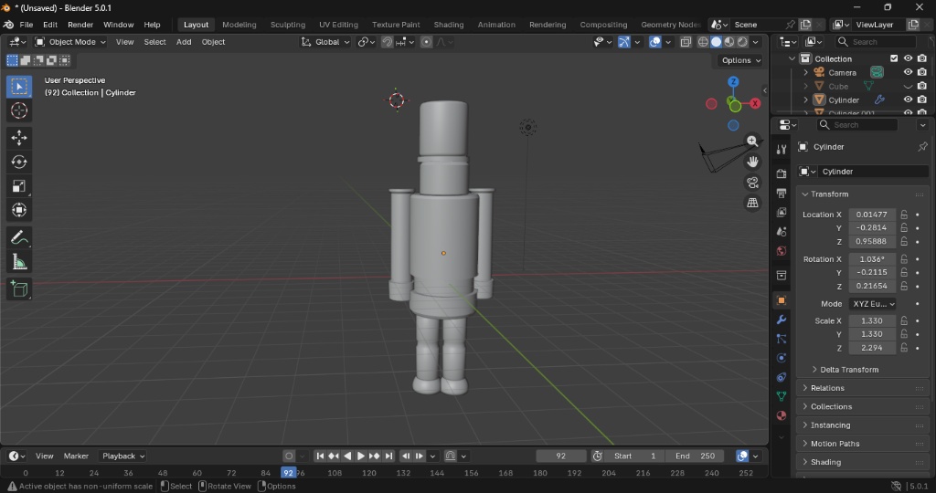 Todo modelado de personaje exitoso comienza con lo que llamamos “blocking”. Se trata de establecer las masas principales sin distraerse con los detalles. Inicié insertando un cilindro (Shift + A). La clave aquí fue la escala no uniforme: al presionar s y luego Z, pude estirar el cilindro para crear el uniforme del soldado. Es un paso crítico, pues si el torso es muy corto, el personaje pierde su esencia de “soldadito de plomo”.
