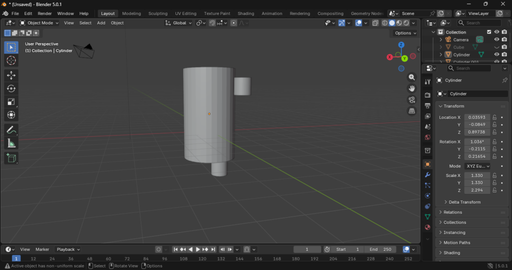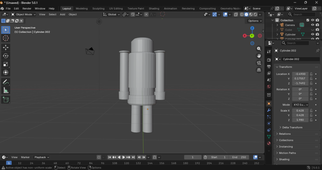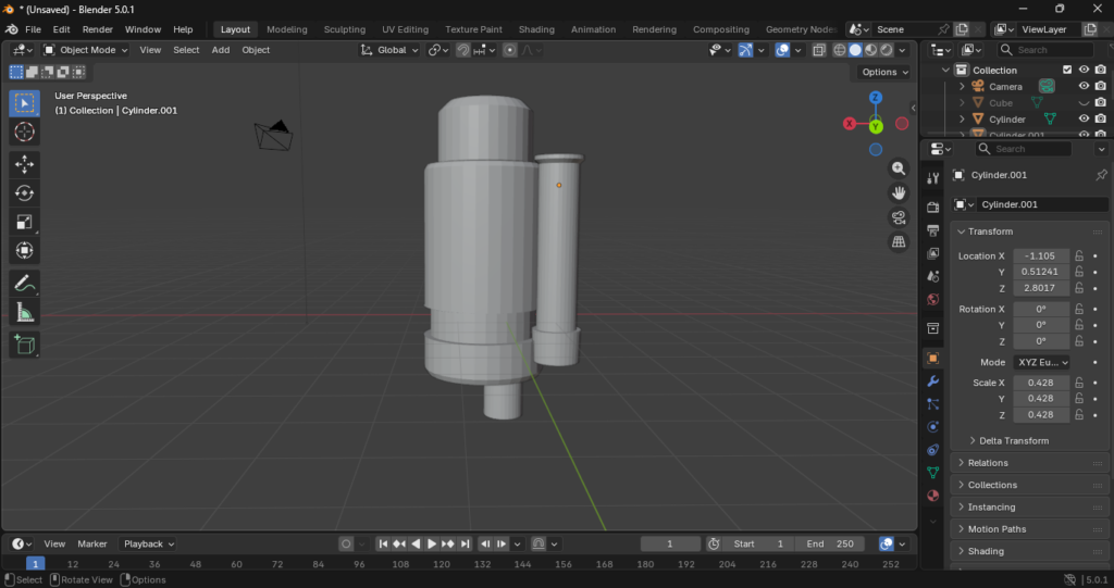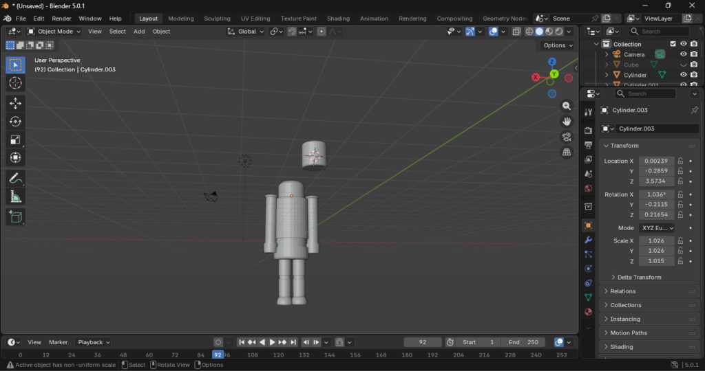 Para las piernas, decidí no crear objetos nuevos desde cero, sino duplicar y ajustar. Utilicé cilindros de menor radio y los posicioné utilizando la vista ortográfica frontal. Trabajar en estas vistas planas es lo que garantiza que el modelo no esté “chueco” cuando lo mires desde otros ángulos. Un error común al empezar es mover objetos solo en la vista 3D libre, lo que suele terminar en desastres de alineación.