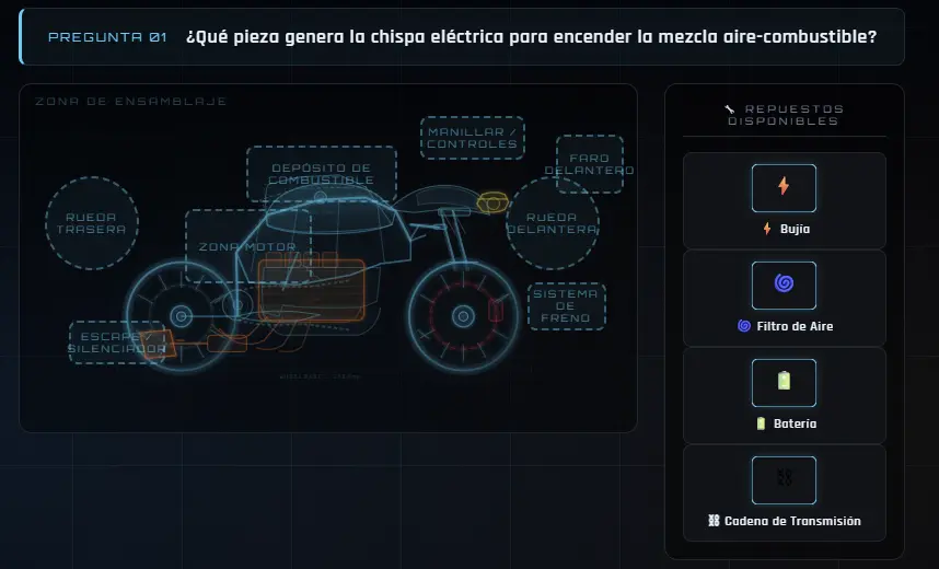 - Mecánica Drag & Drop (Arrastrar y Soltar): El jugador interactúa con un modelo visual de motomechanic en el cual hay una motocicleta (un blueprint) y un inventario de piezas. Ante una pregunta técnica aleatoria, debe arrastrar el componente correcto a su zona de destino específica