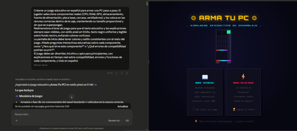Modelos de IA permiten crear el HTML base, el CSS, las lógicas del juego, validaciones de compatibilidad y sistemas de puntuación. Esta capacidad de iteración rápida es una de las mayores ventajas.