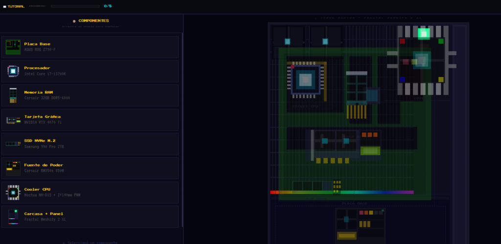 “Arma tu PC” es un simulador educativo donde el usuario ensambla un computador seleccionando piezas compatibles. No es un formulario estático, sino un sistema lógico que valida decisiones en tiempo real.