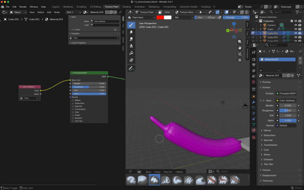 - Tip: En el Shader Editor, añade un nodo Attribute (escribe “Color”) y conéctalo al Base Color del material para que se vea en el render.