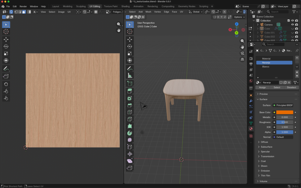 - Mapeo UV: Entra en modo edición, selecciona todo (A) y presiona U > Smart UV Project. Esto es necesario para que la imagen de madera se proyecte sin distorsiones sobre el modelo.