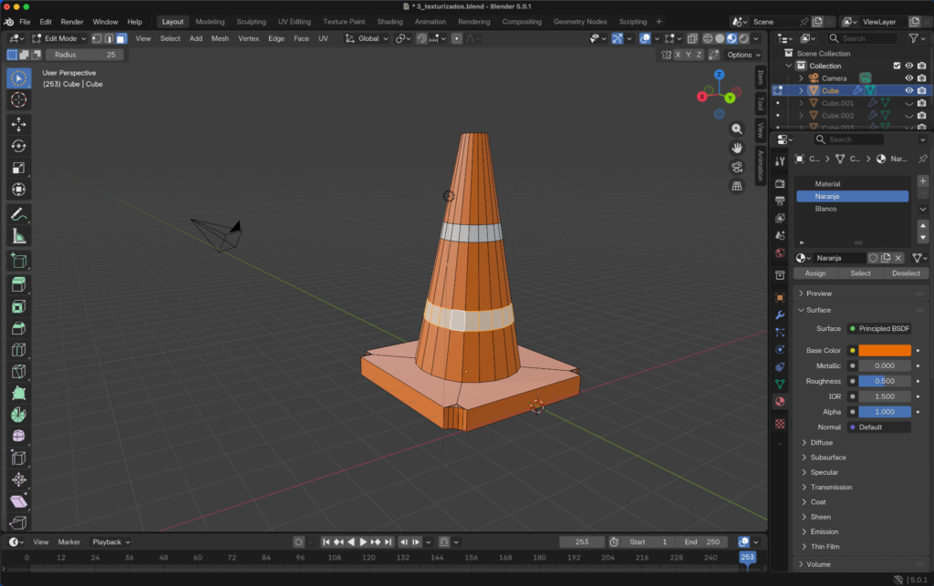 Figura 2: Uso de Loop Cuts para delimitar las zonas de color en el cono de tráfico.