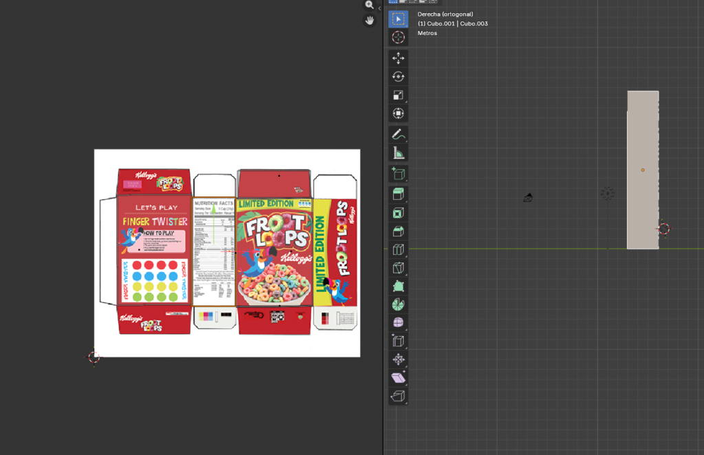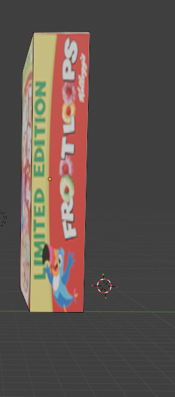 Ajuste de UVs y vista lateral En la imagen de arriba vemos que la caja está acostada de lado en la escena mientras ajustamos algo. Abajo vemos el resultado de uno de los laterales de la caja con el diseño “Limited Edition Froot Loops” correctamente mapeado.