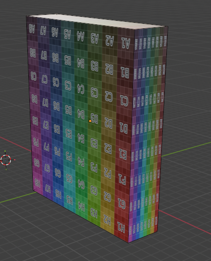Aplicamos una textura de prueba de UVs Le aplicamos al cubo una textura de cuadrícula de colores que se llama “Imagen de prueba UV” o “Rejilla de color”. Esta textura sirve para ver cómo están distribuidas las UVs sobre el objeto: si los cuadros se ven todos del mismo tamaño y sin deformaciones, significa que las UVs están bien. Se puede ver que el cubo tiene celdas con letras y números de colores por todo el cuerpo.