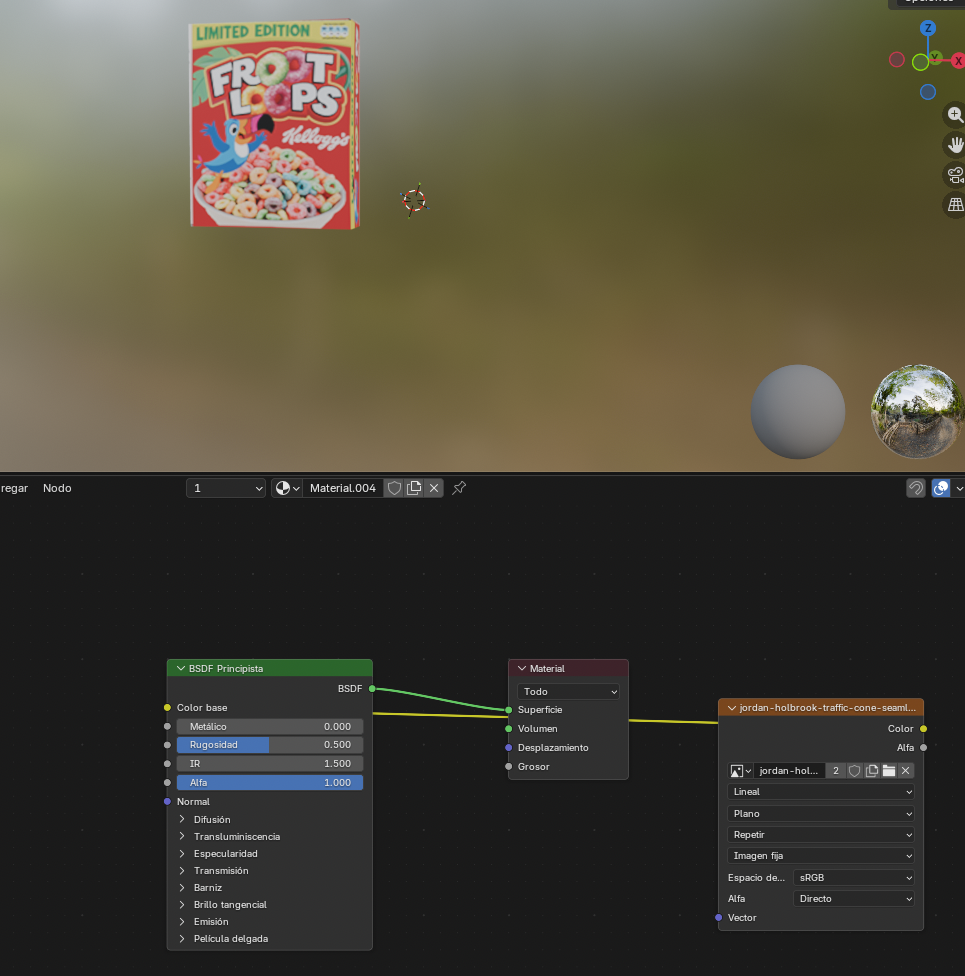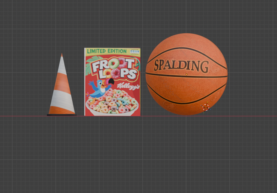 Resultado final con los tres objetos En la primera imagen vemos el balón de cerca con toda la textura bien mapeada. En la segunda imagen vemos los tres objetos juntos en la misma escena: el cono de tráfico con sus franjas naranjas y blancas, la caja de cereal Froot Loops y el balón de básquet Spalding. ¡Este es el resultado final de todo el proceso de texturizado en Blender!