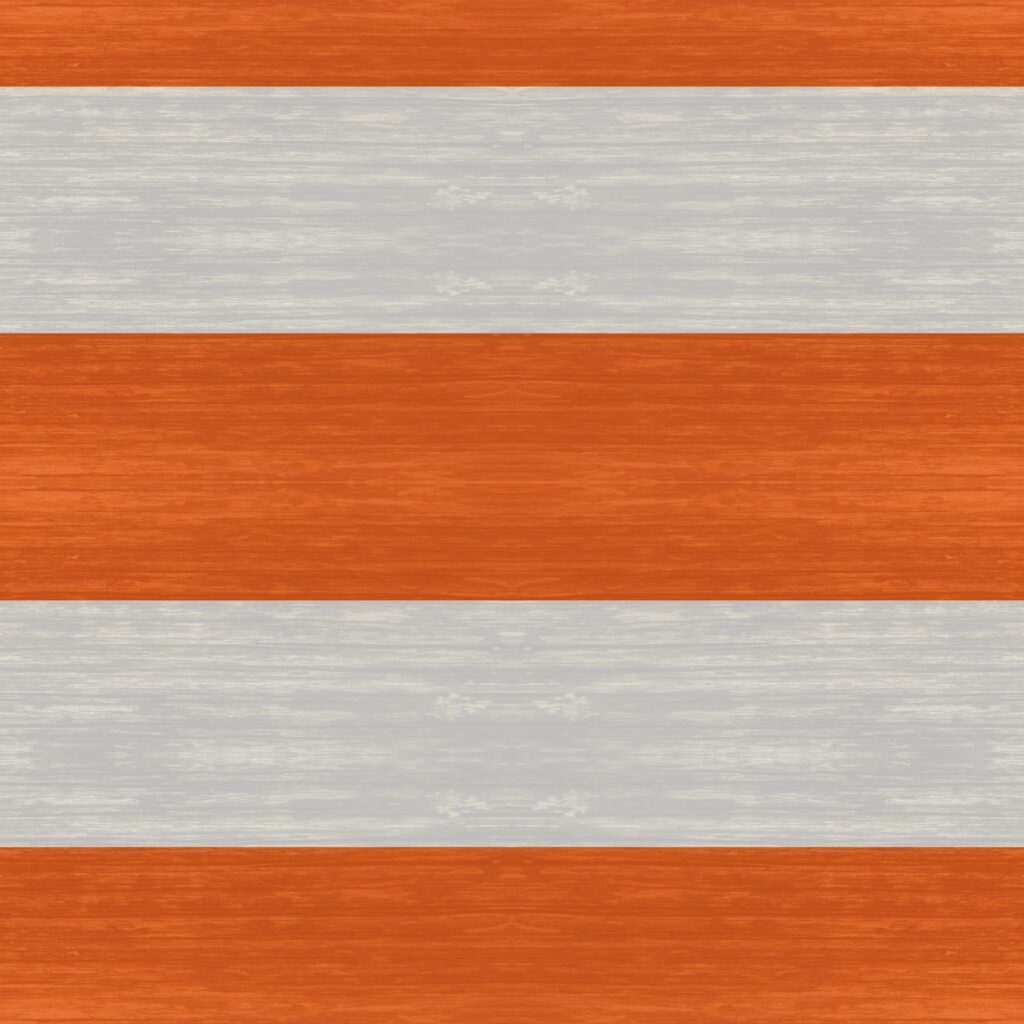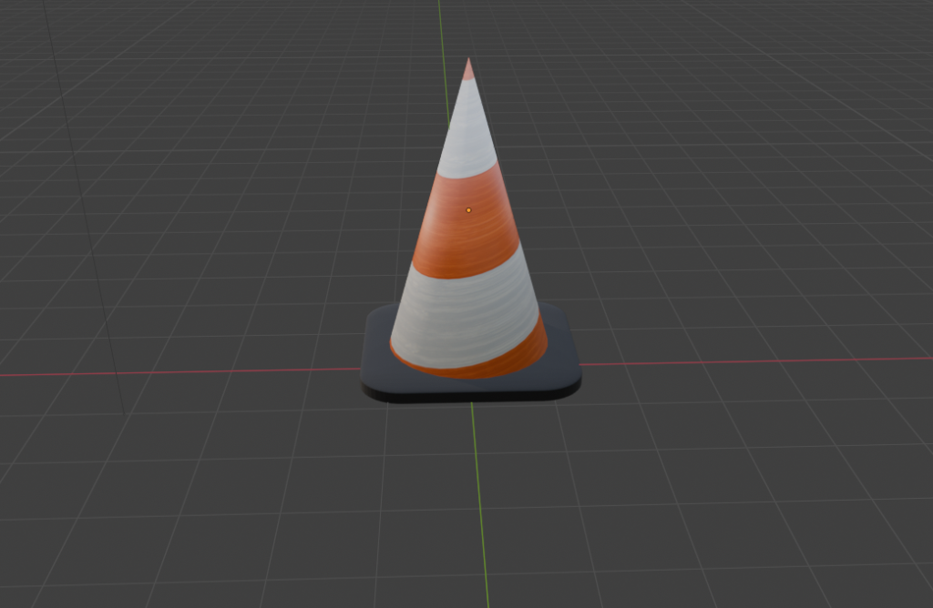 Resultado del cono con textura aplicada El cono ya tiene su textura de franjas naranjas y blancas aplicada correctamente. Se ve muy parecido a un cono de tráfico real. Debajo vemos la imagen de textura que se usó: franjas horizontales alternadas en naranja y blanco con una textura de madera o plástico.