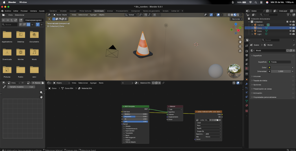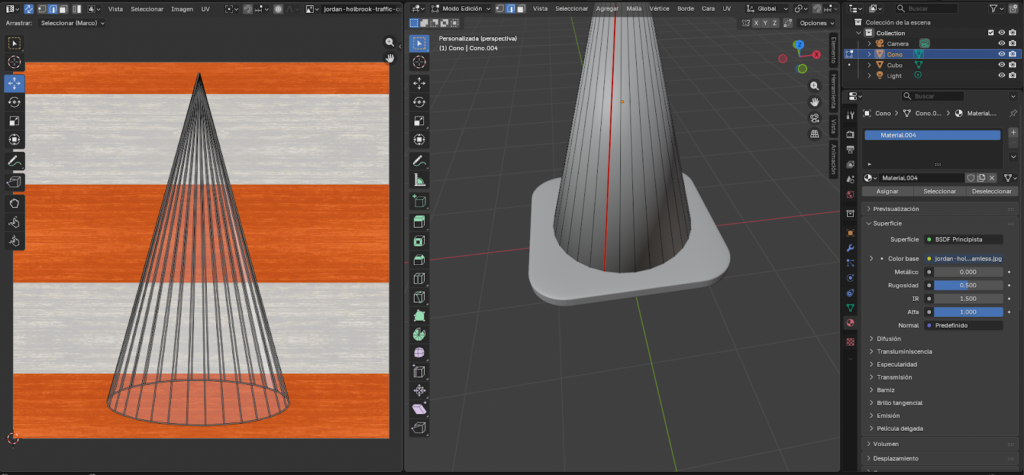Abrimos el Sombreado y preparamos la textura del cono Nos vamos a la pestaña de Sombreado (la barra de arriba). Ahí vemos el editor de nodos en la parte de abajo. En el panel de la derecha, en Propiedades > Material, vemos que el material del cono ya tiene una imagen de textura cargada con franjas naranjas y blancas, que es la textura típica del cono de tráfico. En la segunda imagen de esta página se ve el editor de UVs a la izquierda con el mapa de coordenadas del cono desplegado.