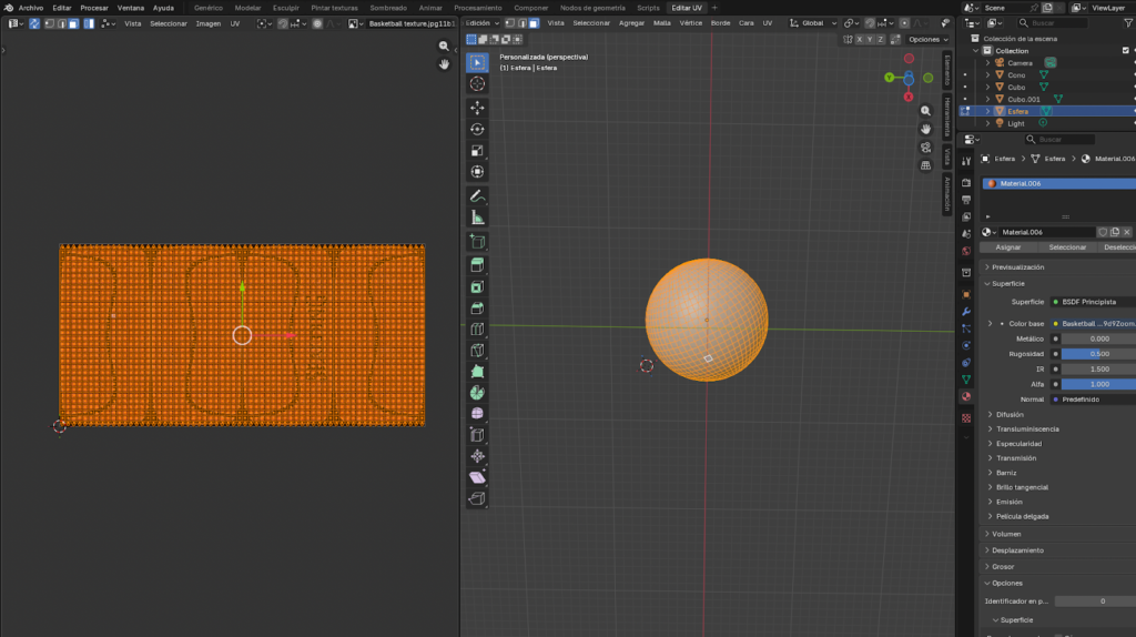 Aplicamos textura a la esfera en la primera imagen vemos la esfera con una textura de cuadrícula de colores y números en el editor de Sombreado, con los nodos conectados en la parte de abajo. En la segunda imagen ya pasamos al editor de UVs donde vemos el mapa UV de la esfera desplegado sobre una textura de balón de básquet. A la derecha se puede ver la esfera con la textura de básquet comenzando a aparecer.