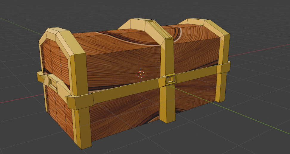 Se obtiene un cofre con estructura detallada, franjas decorativas, broche frontal y textura tipo madera con bordes dorados.