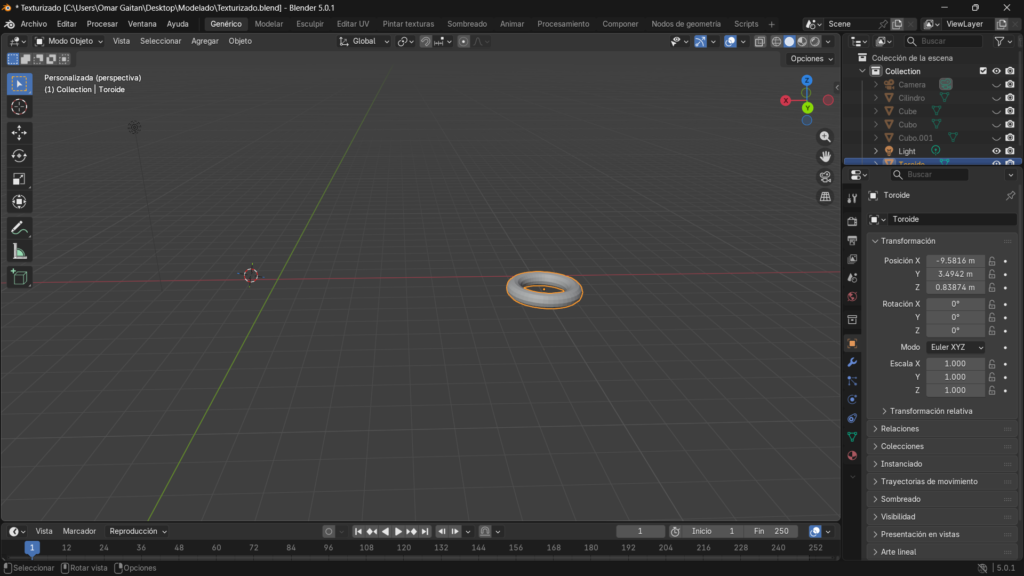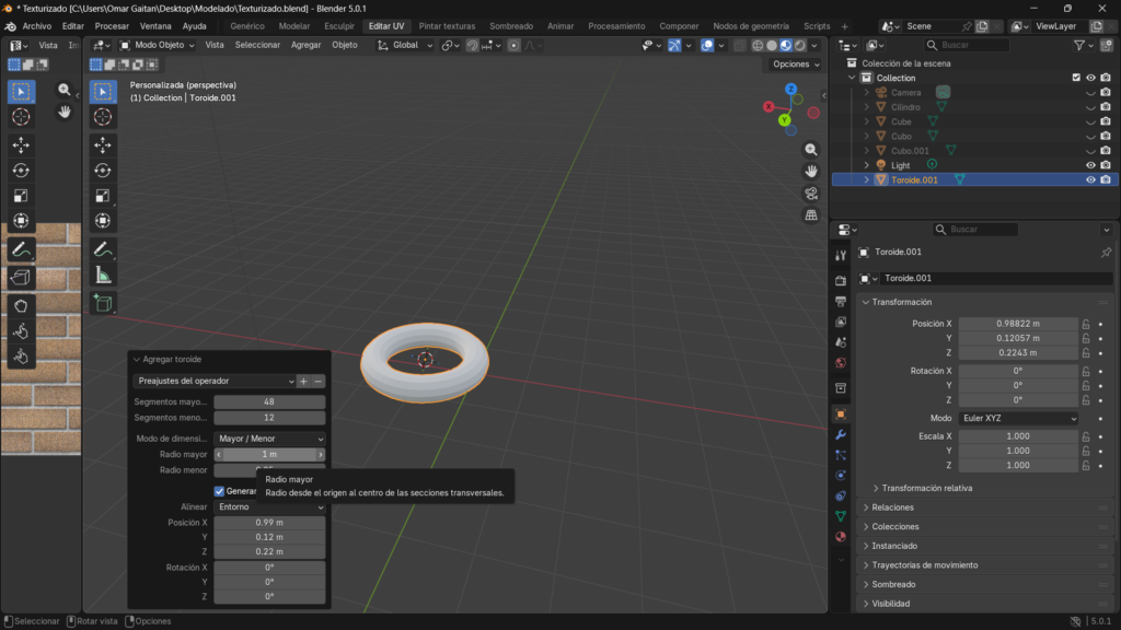 Luego dentro de las propiedades modelado ajustamos los radios para que tenga forma de una dona.