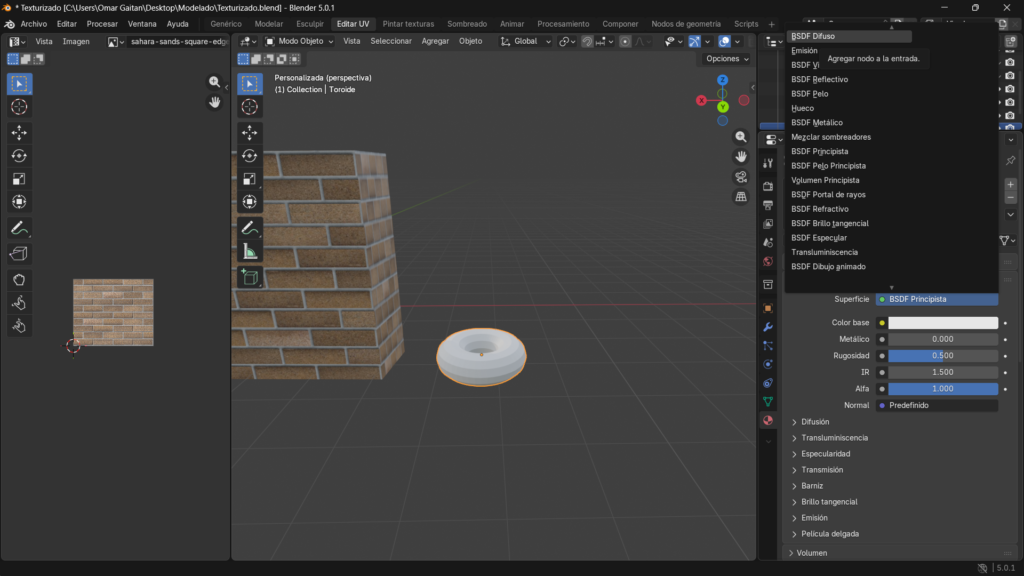 Como en el anterior modelado para la textura nos dirigiremos a la misma ventana y seleccionamos la imagen que descargamos para nuestra dona.