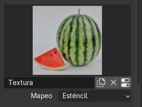 Luego de esto, iremos a las opciones de la parte derecha, buscando la opción “Textura”, ahí vamos a Nueva, luego a la opción de “Textura” de la barra de herramientas, la cual está con el logo de un cuadro de ajedrez rojo. Esto abrirá un menú, en donde daremos clic en “Abrir” y seleccionaremos la primera imagen que corresponde a la sandía.